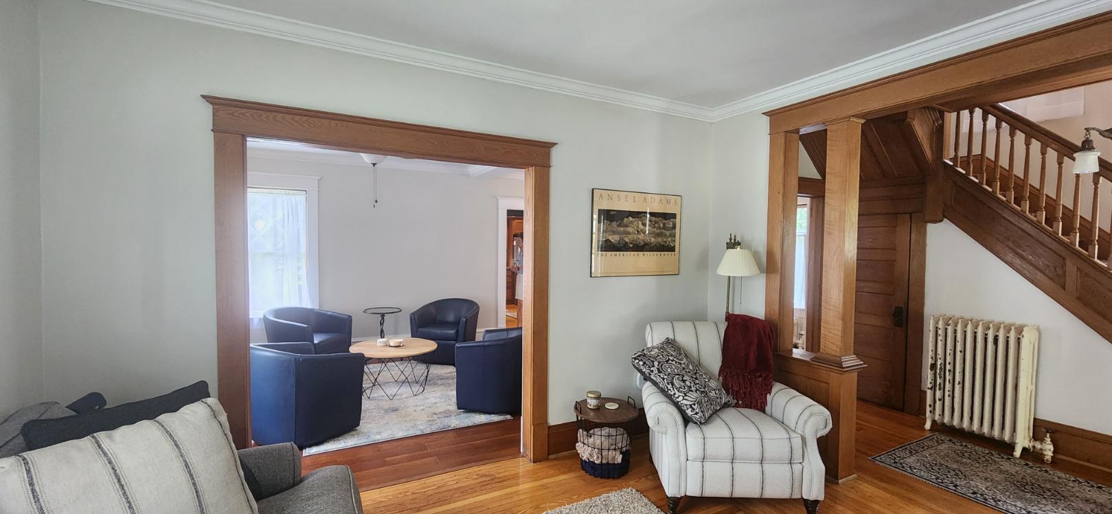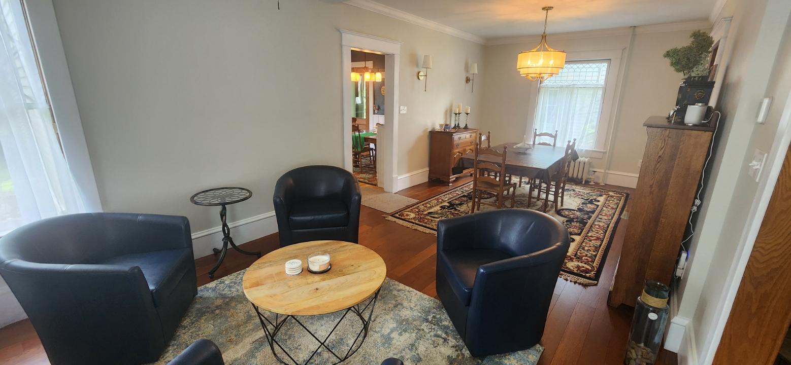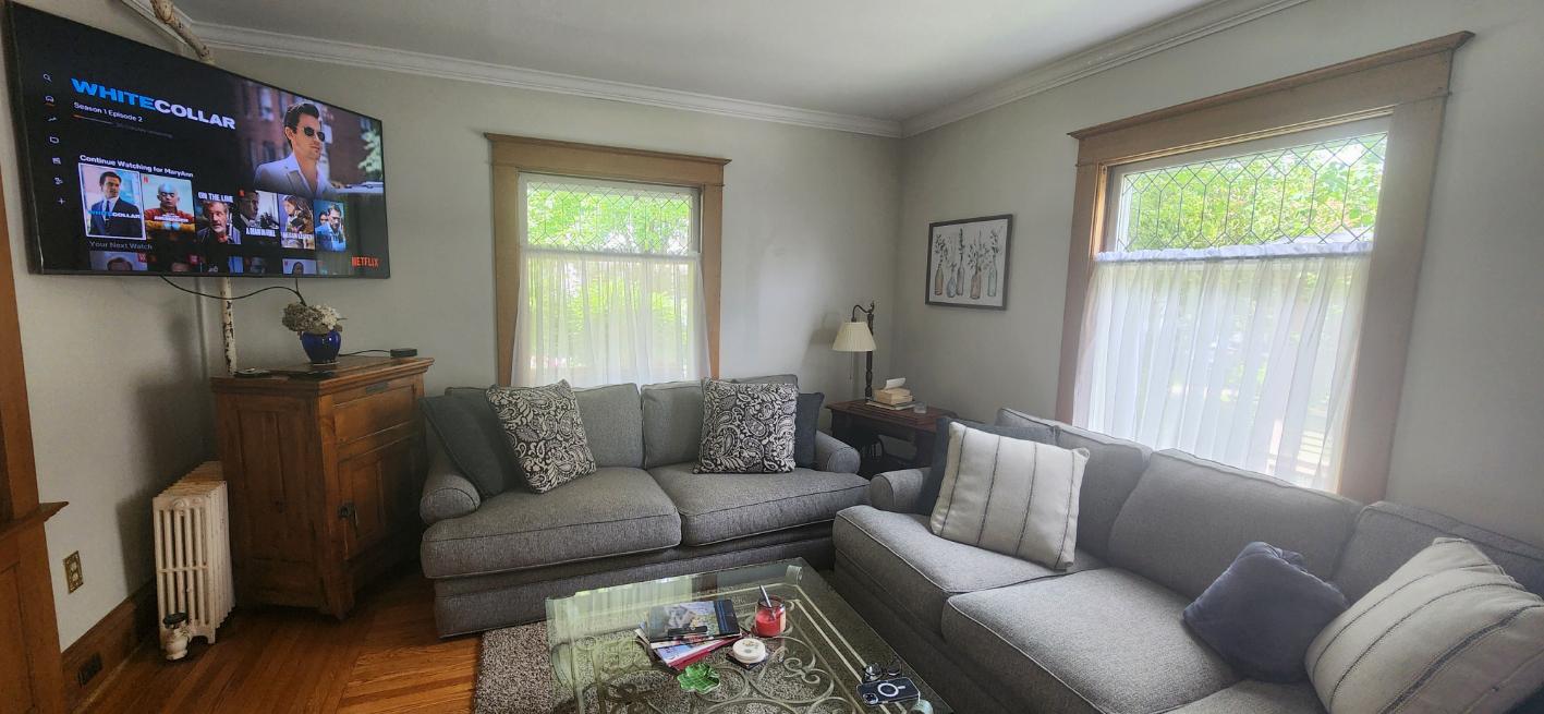 en suite, half bath on first floor. Hardwood floors throughout. Formal dining room, sitting room, and living room with large flatscreen TV. New comfortable large couches. Fully equipped, eat in kitchen. First floor laundry room. Cozy front porch for coffee and / or cocktails. Back yard patio with Weber glass grill. Off street parking in driveway. No smoking.