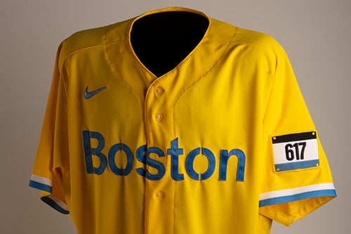 On April 6, 2021, Major League Baseball unveiled the first of their new City Connect Series of uniforms, with the Red Sox donning innovative duds inspired by Patriots’ Day and the Boston Marathon. This jersey was worn by Xander Bogaerts, the only shortstop in Red Sox history with multiple Silver Slugger Awards.