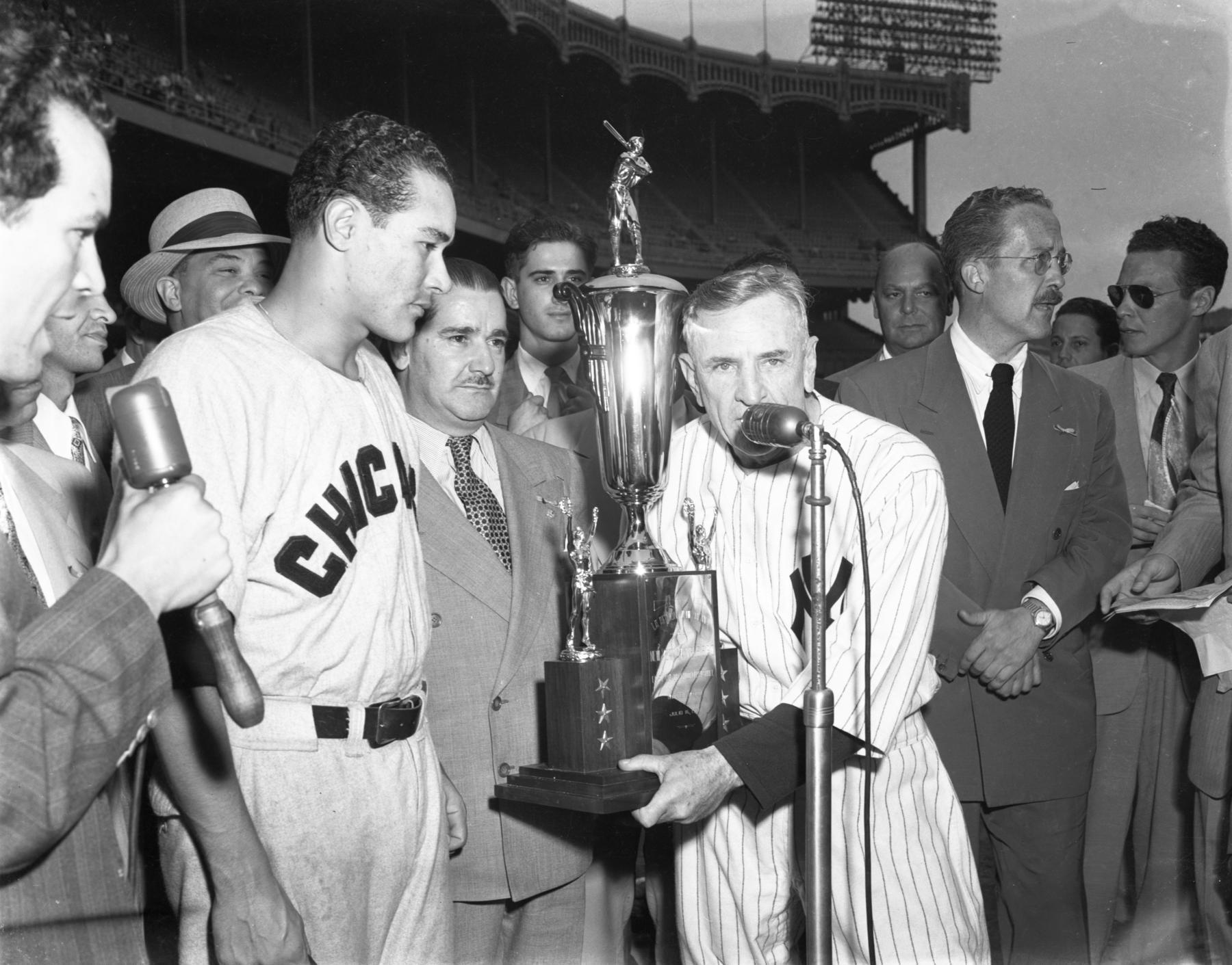 This image, taken between games of a doubleheader on July 16, 1950 by acclaimed photographer Osvaldo Salas, shows Yankees manager Casey Stengel (right) accepting a trophy on behalf of his team as a goodwill token from the people of Venezuela. Standing to the left is 24-year-old Carrasquel, the only native Venezuelan in the majors at the time, sporting the gray road uniform of the White Sox, with “Chicago” emblazoned across the front of the jersey.
