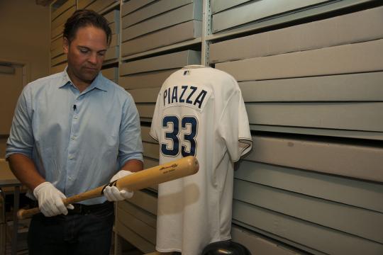 While visiting the National Baseball Hall of Fame, Mike Piazza holds the bat he used to break Carlton Fisk's home run record, with his 352nd home run. (Milo Stewart Jr. / National Baseball Hall of Fame)