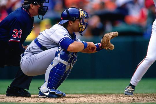 Mike Piazza of the Los Angeles Dodgers catching during a game against the San Francisco Giants in 1996. (Brad Mangin / National Baseball Hall of Fame Library)