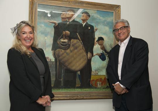 Cindy Lou Wakefield and Rick Friedman pose in front of Norman Rockwell's Saturday Evening Post illustration, Tough Call, in the Museum's Art Gallery. (Milo Stewart Jr. / National Baseball Hall of Fame)