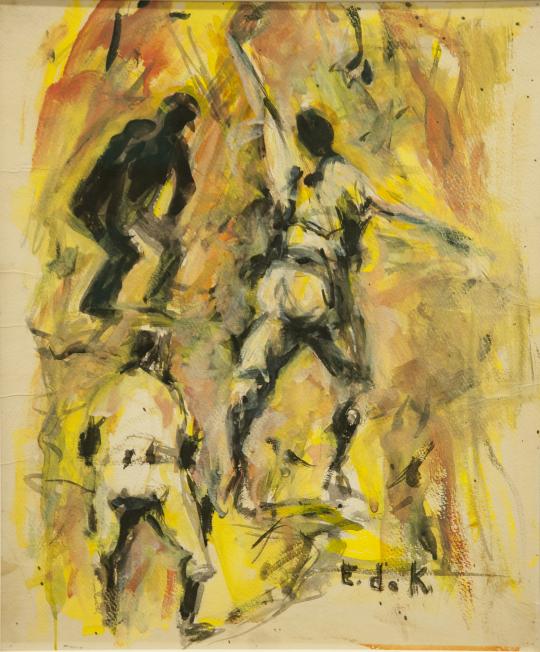 De Kooning was one of the pioneers of the early 1950's Abstract Expressionist movement in America. Her work was featured in some of the breakthrough New York City art gallery shows of that era, notably her first solo exhibition in 1952, at the Stable Gallery in New York. One of the few women of her time to receive acclaim, she had a more extensive sports background, creating numerous pieces that depicted baseball and basketball players. An avid baseball fan who was fascinated by their “stances”, she traveled with the New York Yankees and Baltimore Orioles in 1953 and 1954, and years later created a show called “Hoops and Homers,” entirely dedicated to the two sports. Her watercolor “The Baseball Catch,” depicts a catcher reaching for a ball while an umpire looks on in the background.