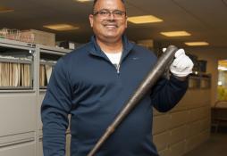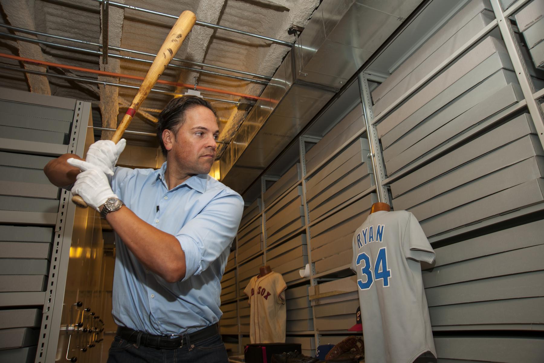 Class of 2016 electee Mike Piazza gets into a batter's stance during his Hall of Fame Orientation Visit on March 8, 2016. Piazza is holding the bat that his childhood hero, Hall of Famer Mike Schmidt, used to hit his 536th home run and tie fellow Hall of Famer Mickey Mantle on the all-time career homer list. (Milo Stewart, Jr. / National Baseball Hall of Fame)