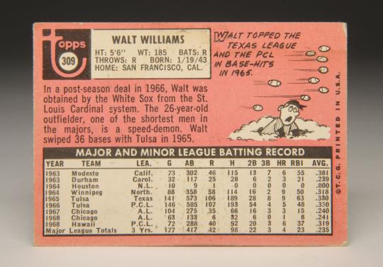 Displaying outfield skills that belied his blocky, bulky appearance, Williams overcame a weak arm and became an adept fielder, best suited for either left field or right field, but with enough speed to merit time as a center fielder. He played his first two seasons as a utility outfielder, filling in for veterans like Ken Berry and Pete Ward. He didn’t hit much, instead contributing with his speed and energy.