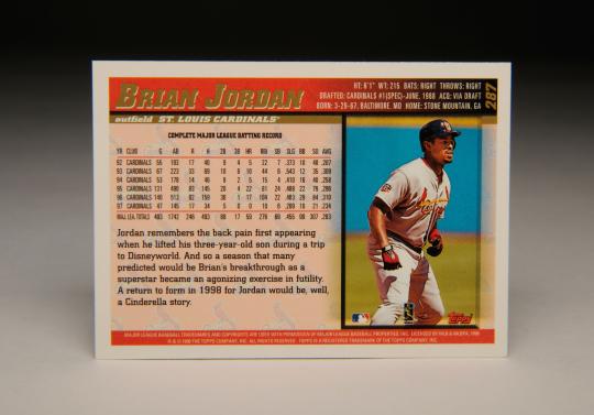 Jordan put together his finest season in 1998, the year that this card was issued to the public. He achieved a career-high OPS of .902, hit 25 home runs, stole 17 bases, and increased his walk total to 40. His defensive play in right field bordered on the spectacular, as he used his skills as a safety in football to chase down fly balls. With that season serving as a springboard, Jordan cashed in on free agency. The New York Yankees, among other teams, pursued him aggressively, but Jordan opted for a five-year, $35 million deal with the Braves. The contract not only made Jordan a rich man, but it gave him a chance to play for the same franchise as his idol, Hank Aaron.
