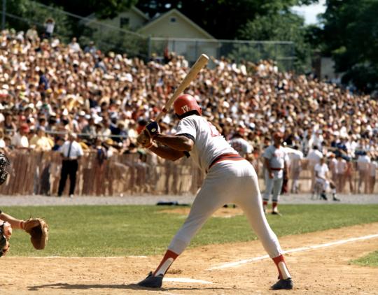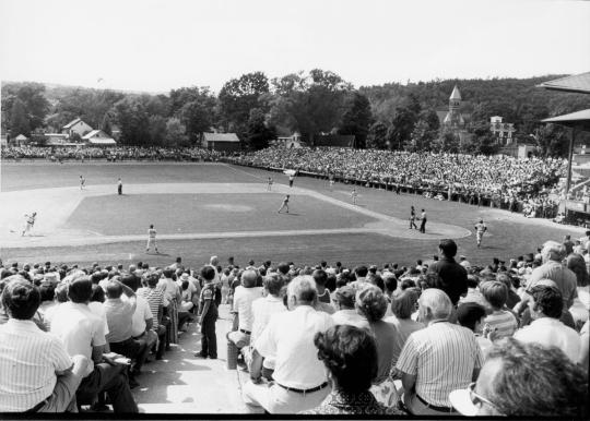 The Boston Red Sox and San Francisco Giants playing on Doubleday Field during the Hall of Fame Game on Aug. 18, 1975. (Bob Bartosz/National Baseball Hall of Fame and Museum)