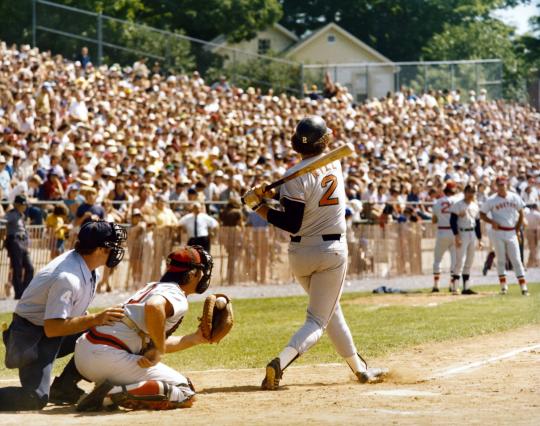 Second baseman Denny Doyle bats for the Boston Red Sox during the 1975 Hall of Fame Game. (National Baseball Hall of Fame and Museum) -