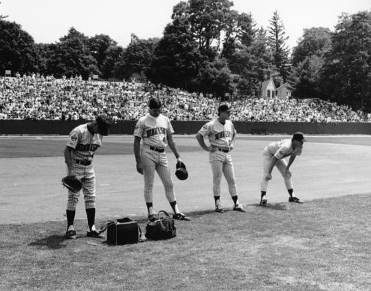 Minnesota Twins players, including Junior Ortiz (foreground), stretch prior to the 1991 Hall of Fame Game. (National Baseball Hall of Fame and Museum) -