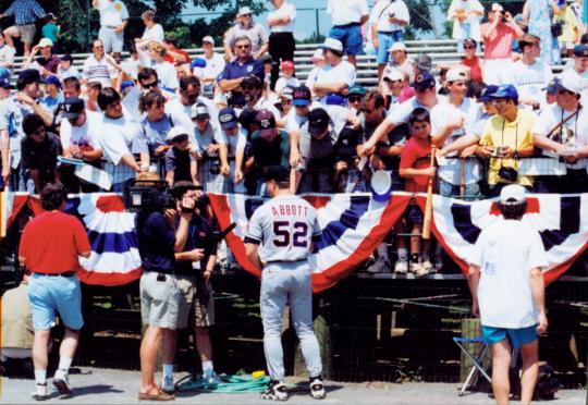 California Angels pitcher Jim Abbott signs autographs for fans at the 1996 Hall of Fame Game. (Tom Ryder/National Baseball Hall of Fame and Museum)