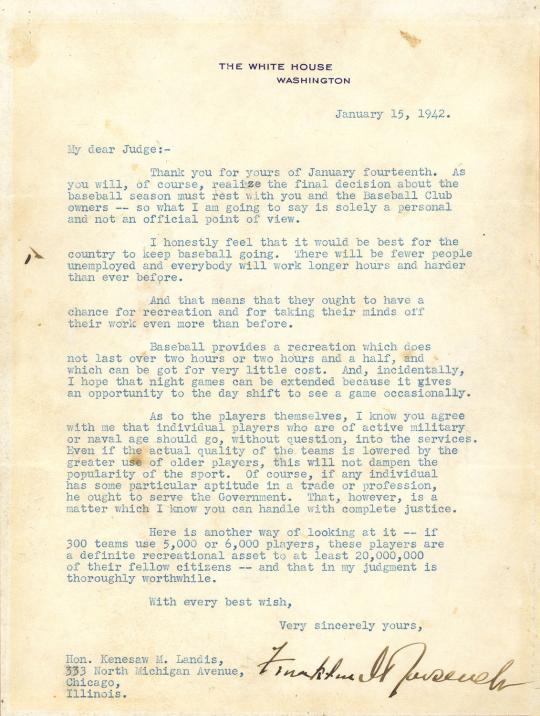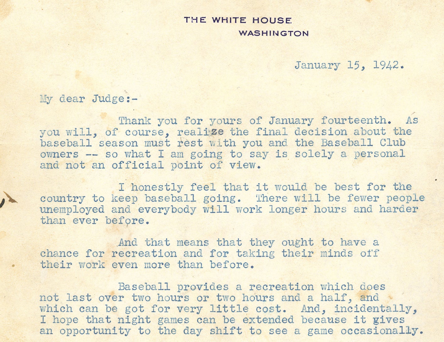 “I honestly feel that it would be best for the country to keep baseball going. There will be fewer people unemployed, and everybody will work longer hours and harder than ever before,” the President wrote in January of 1942. “And that means that they ought to have a chance for recreation and for taking their minds off their work.”