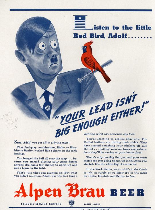 This advertisement for Alpen Brau Beer, featuring Adolf Hitler, was used in the 1942 World Series Program. The poster tells Hitler that "in the World Series, we trust it's in the Cards to win, as surely we know it's in the cards for Hitler, Hirohito and Benito to lose." (National Baseball Hall of Fame)