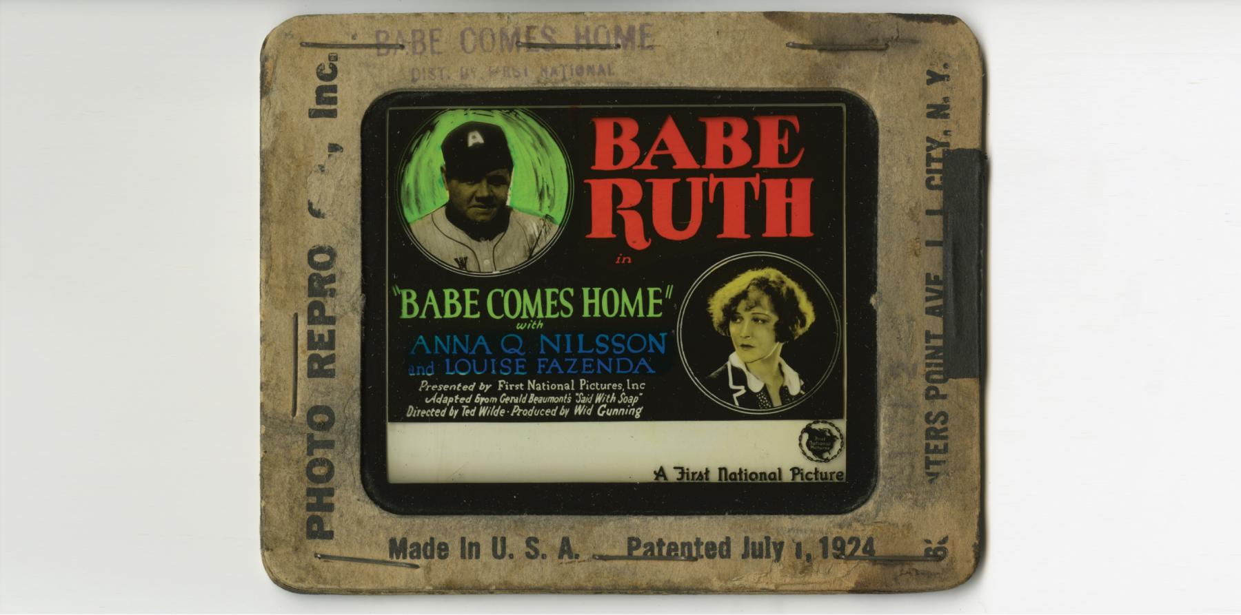 The National Baseball Hall of Fame and Museum’s permanent collection includes a color "coming attraction" advertising lantern slide in cardboard mount, 4 inches wide and 3 ¼ inches high, for “Babe Comes Home.”
