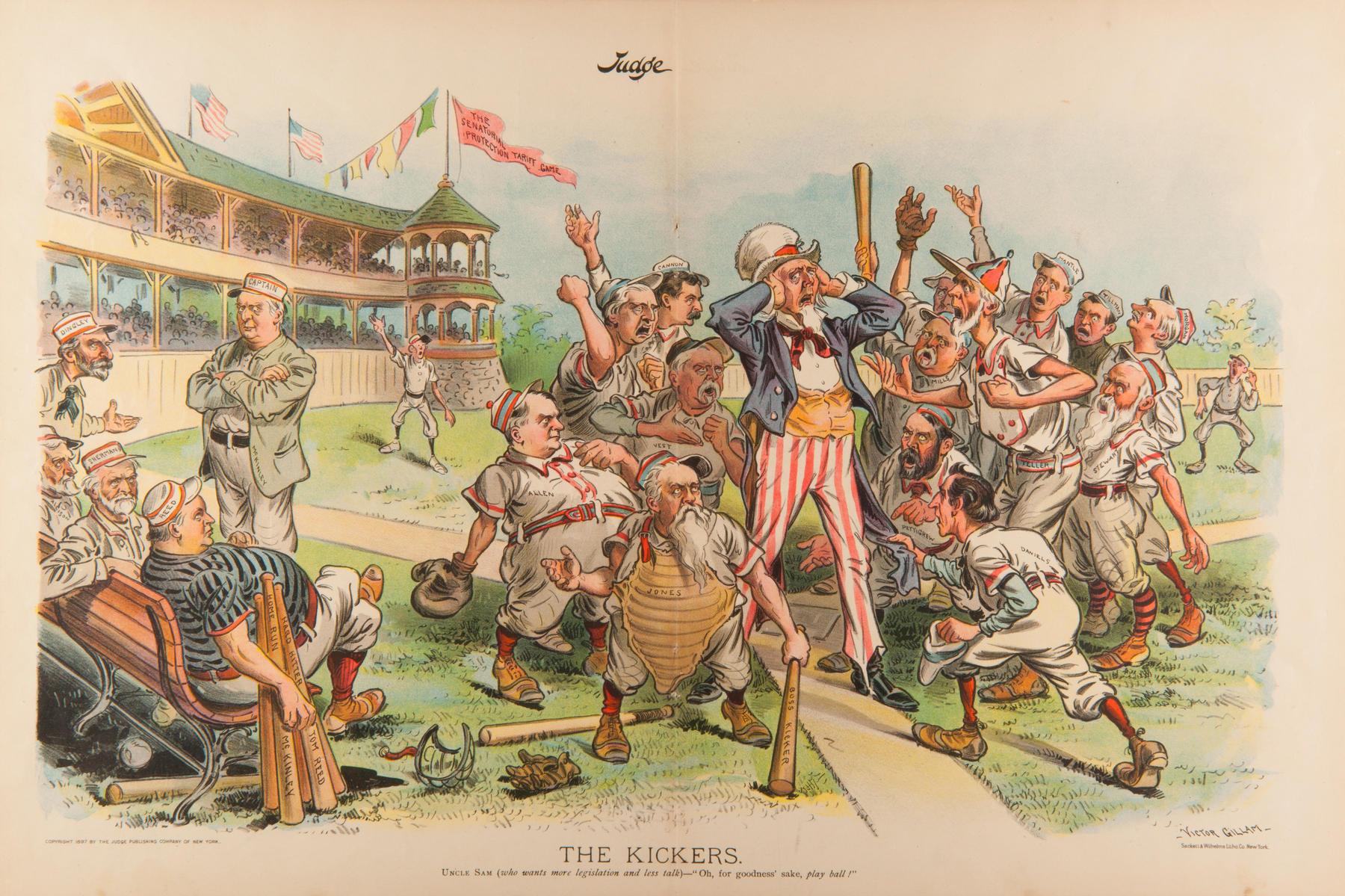 In this 1897 lithograph from Judge, “The Kickers,” cartoonist Victor Gillam depicts various United States senators arguing with Uncle Sam, the umpire. This coincided with the fierce Senate debate over proposed tariff revisions. (BL-387.2001 – Milo Stewart Jr./National Baseball Hall of Fame Library)