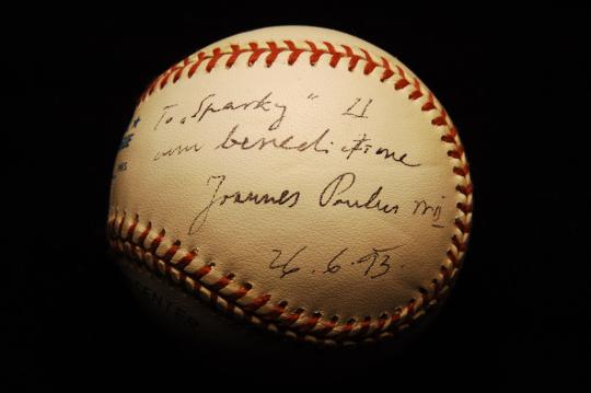 Sparky Anderson donated this baseball, which was signed for him by Pope John Paul II in 1993, to the National Baseball Hall of Fame and Museum during his orientation tour as a new inductee in 2000. Written in Latin, the Pope's message to Anderson translates as, “To Sparky, with blessing.” B-17-2002 (Milo Stewart, Jr. / National Baseball Hall of Fame)