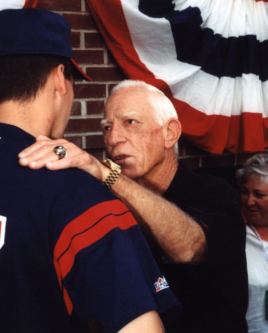 Sparky Anderson, one of the 2000 Hall of Fame inductees, chats with a Cleveland Indians player at the July 24, 2000, Hall of Fame Game at Doubleday Field. (Tom Ryder/National Baseball Hall of Fame and Museum)