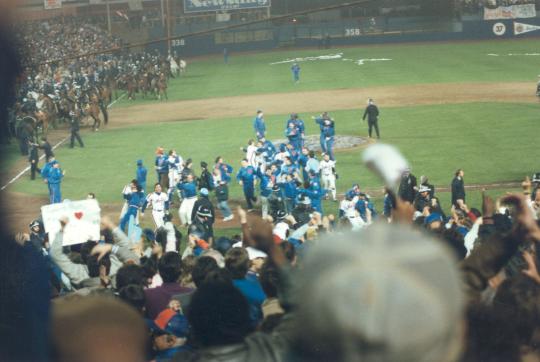 But the Mets had different ideas, and again it started with their leader Carter, who stroked a two-out single to left. Mitchell was quickly dragged out of the clubhouse and into the game to bat for pitcher Rick Aguilera, and he promptly responded with a hit. Then Ray Knight, down to his final strike, lofted a jam shot just past second base to score Carter from second.