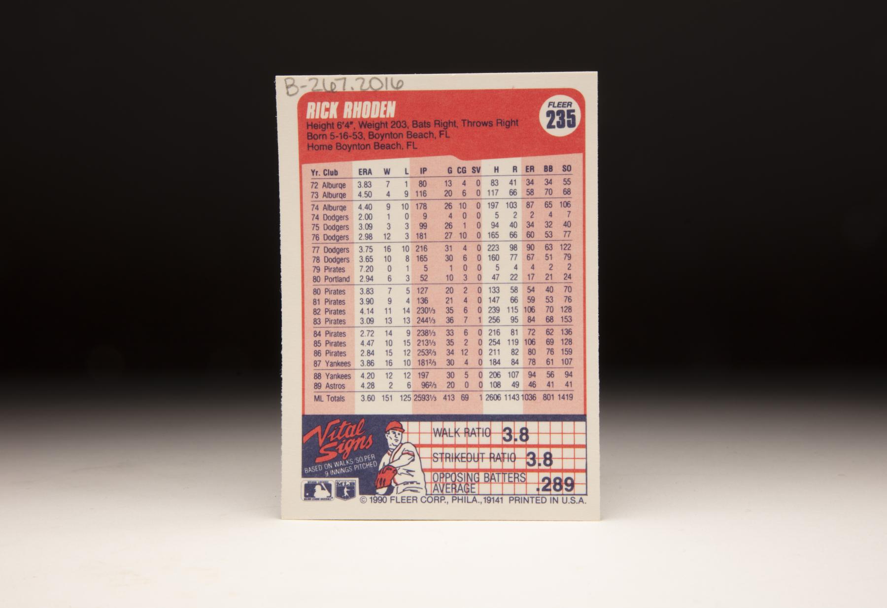 Over his 16 seasons in the big leagues, Rhoden went 151-125 with a 3.59 ERA and 1,419 strikeouts. At the plate, Rhoden hit .238 with 75 RBI and 38 doubles in 761 at-bats. And though he never won a Gold Glove Award, Rhoden posted a perfect 1.000 fielding percentage in exactly half of his MLB seasons, finishing with a career mark of .9894 – the best mark of any pitcher with at least 2,000 innings worked.