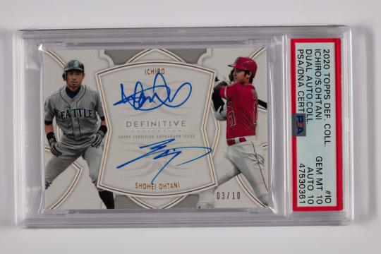 Topps has released unique cards fitted with two beloved players at a time, their autographs hovering in the center, surrounded by lively action shots of the players as they practically jump from the card. This 2020 Topps card features Ichiro Suzuki (left) and Shohei Ohtani (right) and their autographs. (Milo Stewart Jr./National Baseball Hall of Fame and Museum)