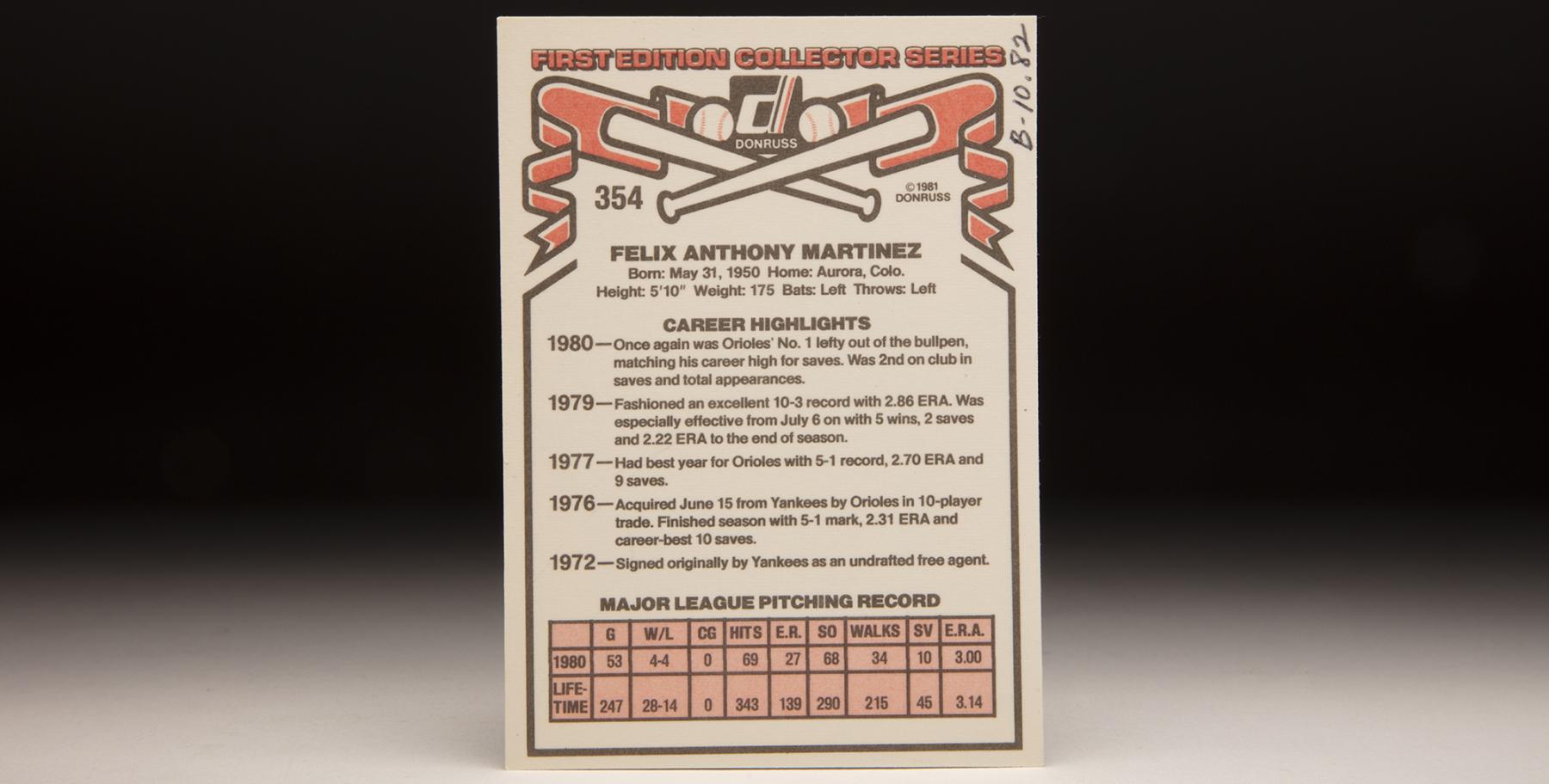 Appearing in a career-high 53 games in 1980, Martinez went 4-4 with 10 saves and a 3.01 ERA for a Baltimore team that won 100 games but finished three behind the Yankees in the division. He signed a five-year contract extension in January of 1981 that would keep him with the Orioles through 1986, and Martinez went 3-3 with 11 saves and a 2.90 ERA in 37 games in the strike-shortened ’81 campaign.