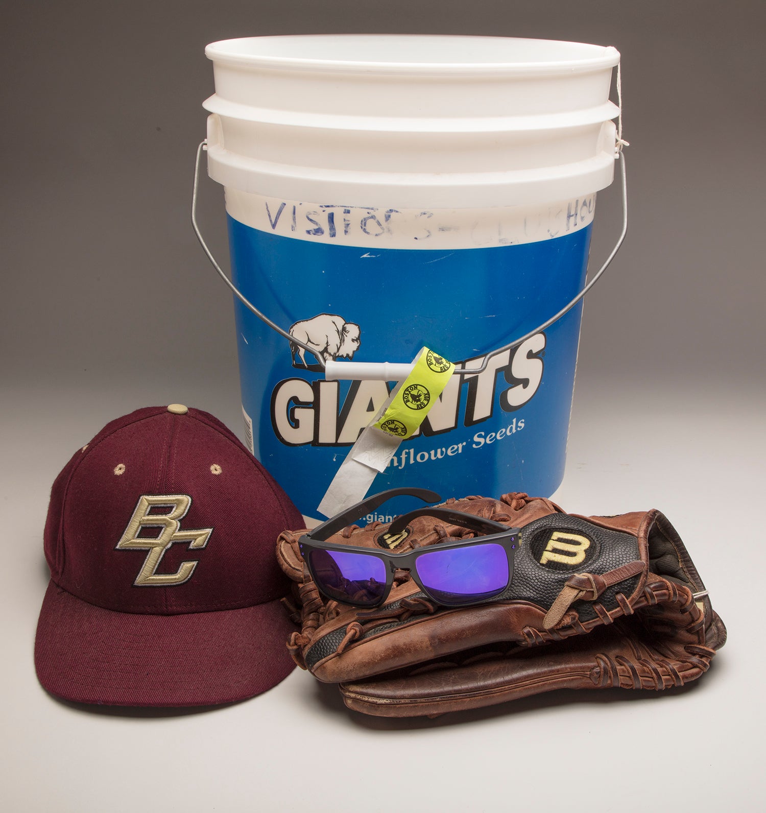Included among the artifacts in the “Baseball and ALS” exhibit are the June 1939 letter Gehrig received from the Mayo Clinic stating that he was suffering from ALS; the bat used by Gehrig to homer off Dizzy Dean in the 1937 All-Star Game; a silver trophy Gehrig received on July 4, 1939; Hunter’s cap from his 1968 perfect game; a ballpoint pen Hunter used to sign a free-agent deal with the Yankees on Dec. 31, 1974; Frates’ glove used while playing outfield for Boston College; and the bucket from which Frates’ wife, Julie, doused him with ice water in 2014 for the first time.