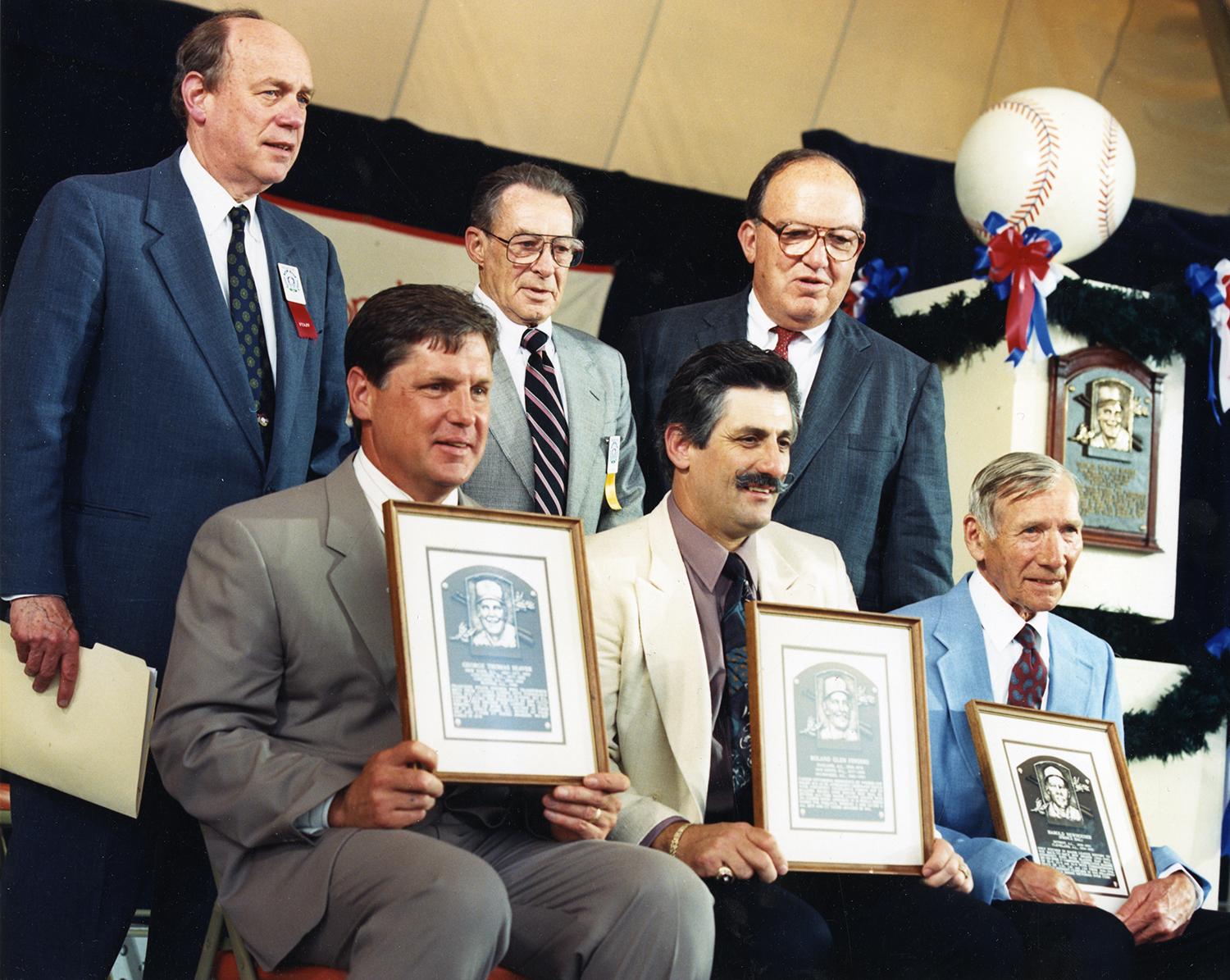 (Bottom row, from left to right): Tom Seaver, Rollie Fingers and Hal Newhouser pose with images of their bronze plaques following the 1992 Induction Ceremony. In the top row, (from left to right) are Chairman of the Board Ed Stack, Bill McGowan Jr. and Commissioner Fay Vincent. (Milo Stewart Jr. / National Baseball Hall of Fame and Museum)