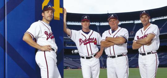 Bobby Cox led the Atlanta Braves, featuring future Hall of Fame pitchers (from left) John Smoltz, Tom Glavine and Greg Maddux, to 15 straight finishes in playoff position from 1991-2005 - a stretch that included five National League pennants and the 1995 World Series title. (National Baseball Hall of Fame and Museum)