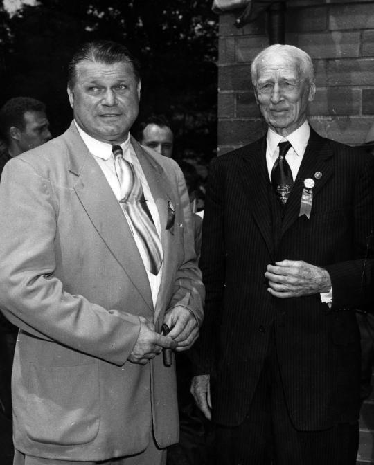 Jimmie Foxx, left, and Connie Mack share a moment at Hall of Fame Weekend 1951 in Cooperstown. Foxx and Mel Ott were inducted into the Hall of Fame on July 23, 1951. Mack, who was elected to the Hall of Fame in 1937, returned to Cooperstown for Induction Weekend to honor Foxx, who played for Mack's Philadelphia Athletics for 11 seasons. (National Baseball Hall of Fame and Museum)