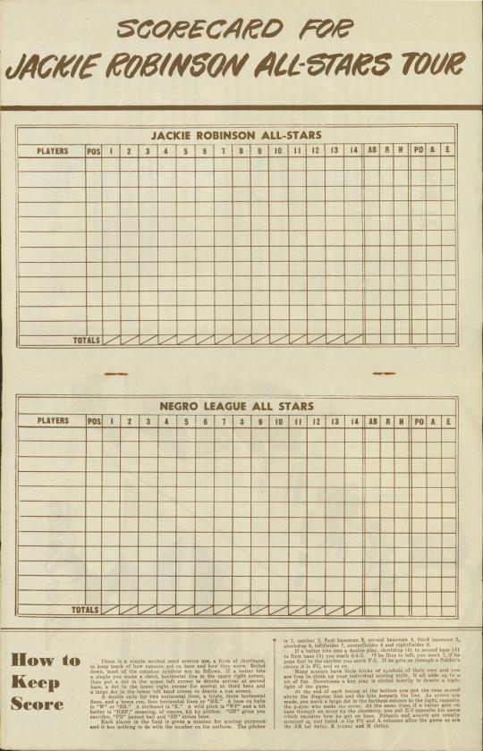 This scorecard was printed ahead of a 1953 exhibition game in which the Jackie Robinson All-Stars faced off against the Negro League All-Stars. Postseason barnstorming tours were common from baseball’s earliest days through the 1950s. (National Baseball Hall of Fame and Museum)