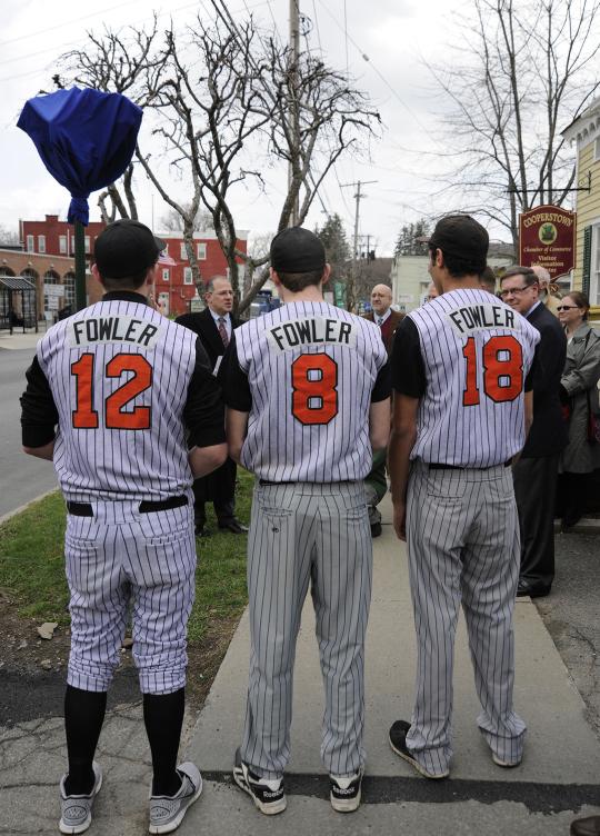Cooperstown High School baseball team members wore “Fowler” nameplates on their jerseys during the 2013 season in honor of Bud Fowler, who grew up in Cooperstown and later became one of the earliest Black professional baseball players. The players dressed in uniform as the Village of Cooperstown dedicated “Fowler Way” on April 20, 2013. (Milo Stewart Jr./National Baseball Hall of Fame and Museum).