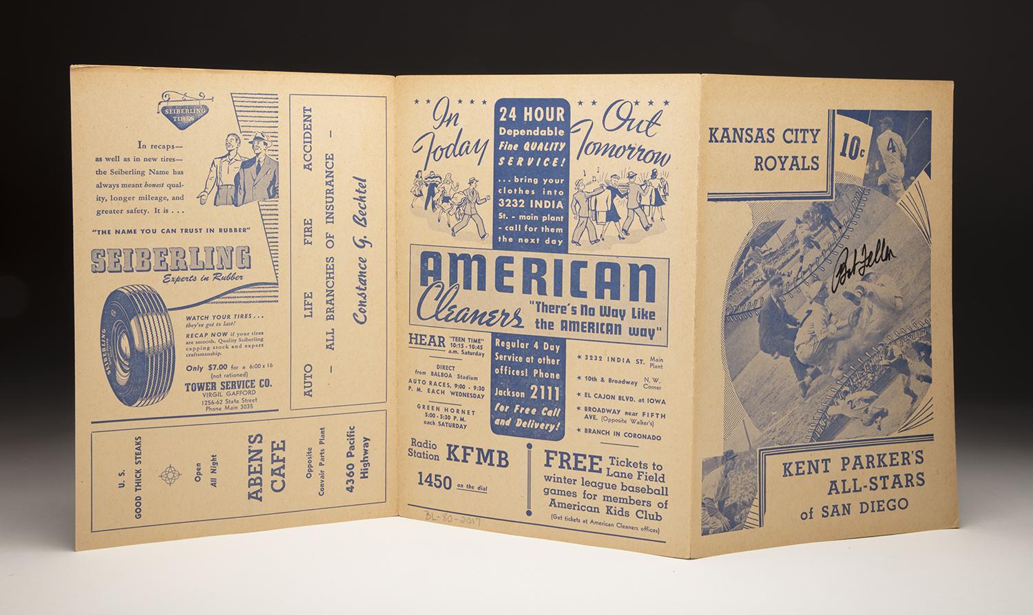 Thanks to a recent donation to the Baseball Hall of Fame Library, we now know that it was expected that Jackie Robinson would play shortstop and bat in the clean-up spot against Bob Feller and other major leaguers. The scorecard is for a game, played Oct. 24, 1945, at Lane Field in San Diego, between Brewer’s Royals and Kent Parker’s Major and Minor League All-Stars, headlined by Feller.