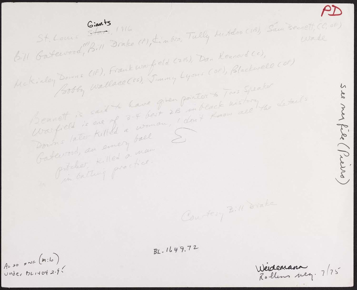 This Negro Leagues team photograph of the 1916 St. Louis Giants, like many other team photographs in the Photo Archives collection, has player names listed on the reverse. However, in addition to these identifications, it also has a few anecdotes included which, while not unheard of, is unusual. Both the identifications and the anecdotal information was written by one of the other players on the team, Bill Drake, who is second from the left in the back row. Two of these anecdotes related by Bill are rather ordinary, referencing achievements in baseball. The other two anecdotes are more surprising and involve McKinley “Bunny” Downs (far left, seated) and Bill Gatewood (far left, standing). They read, “Downs later killed a woman, I don't know all the details. Gatewood, an emery ball pitcher, killed a man in batting practice.”