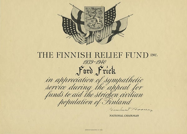 Frick retired after two seven-year terms in the commissioner’s office in 1965. In 1970, he was elected as a member of the Hall of Fame, a museum he helped to create 31 years before. The Museum presented its first annual Ford C. Frick Award, given to broadcasters for major contributions to baseball, in 1978.